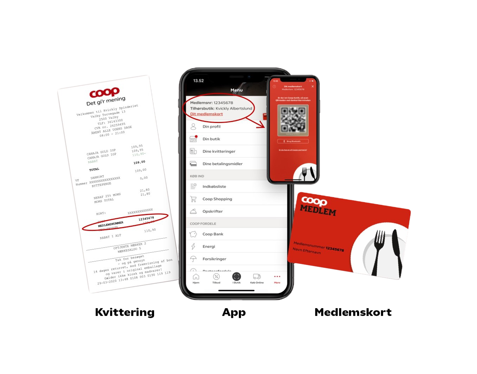 Du kan se dit medlemsnummer på forsiden af dit medlemskort, på ét af dine nøglekort, nederst på én af dine kvitteringer eller under din profil i Coop appen. Efter log ind i appen finder du din profil i øverste højre hjørne.